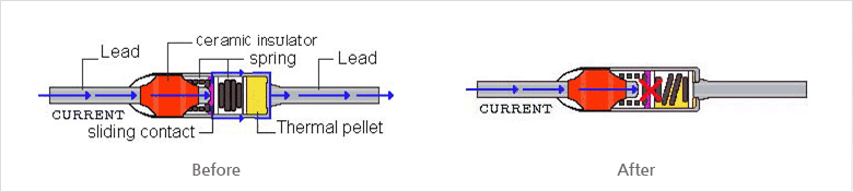 It is a temperature sensing device, but it can only be operated once, when the temperature is higher than its set value, it will disconnect, and after disconnection, the current can not pass through, so as to play the role of power failure. Once disconnected, it will not be like self-resetting thermal cut-out, due to the temperature drop and reset itself to connect to the power supply; can only be partially or complete replaced to connect to the original circuit.